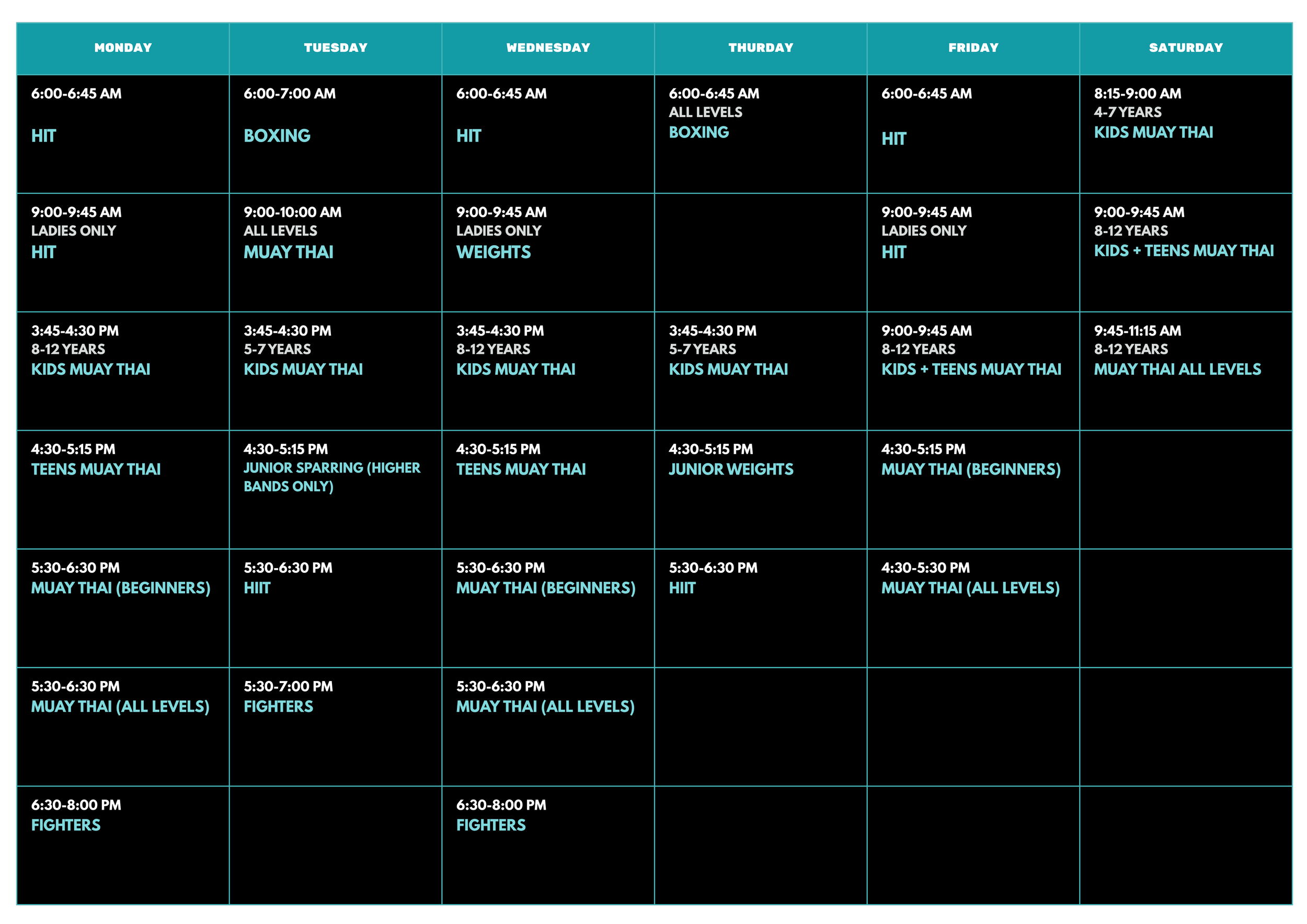 Check out our weekly schedule and level up every session. Whether you're just starting out or sharpening your fight skills, there's a class for every level.